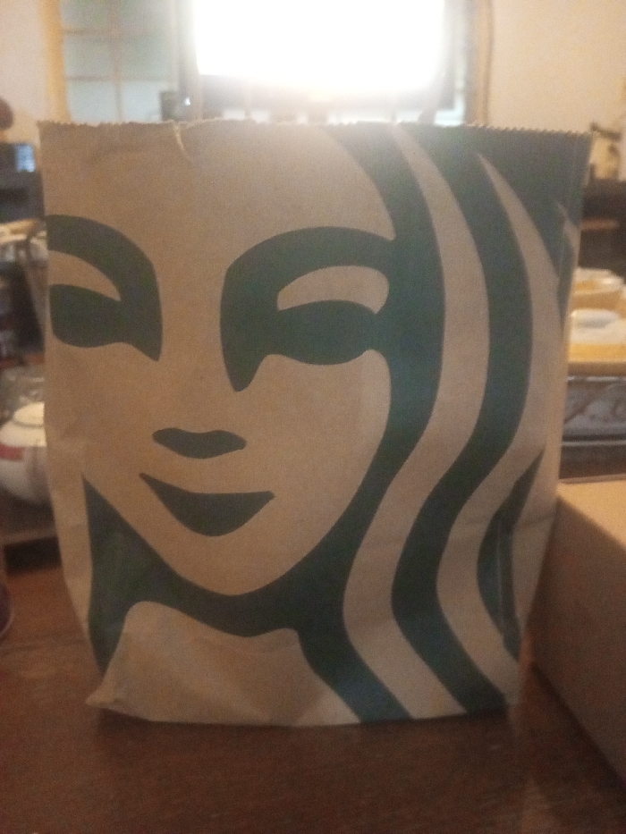 - "A brown paper Starbucks paper bag, featuring the prominent green Siren logo on its front, stands upright on a dark, reddish-brown wooden surface" by FM-pJ4yW2, licensed under CC BY 4.0