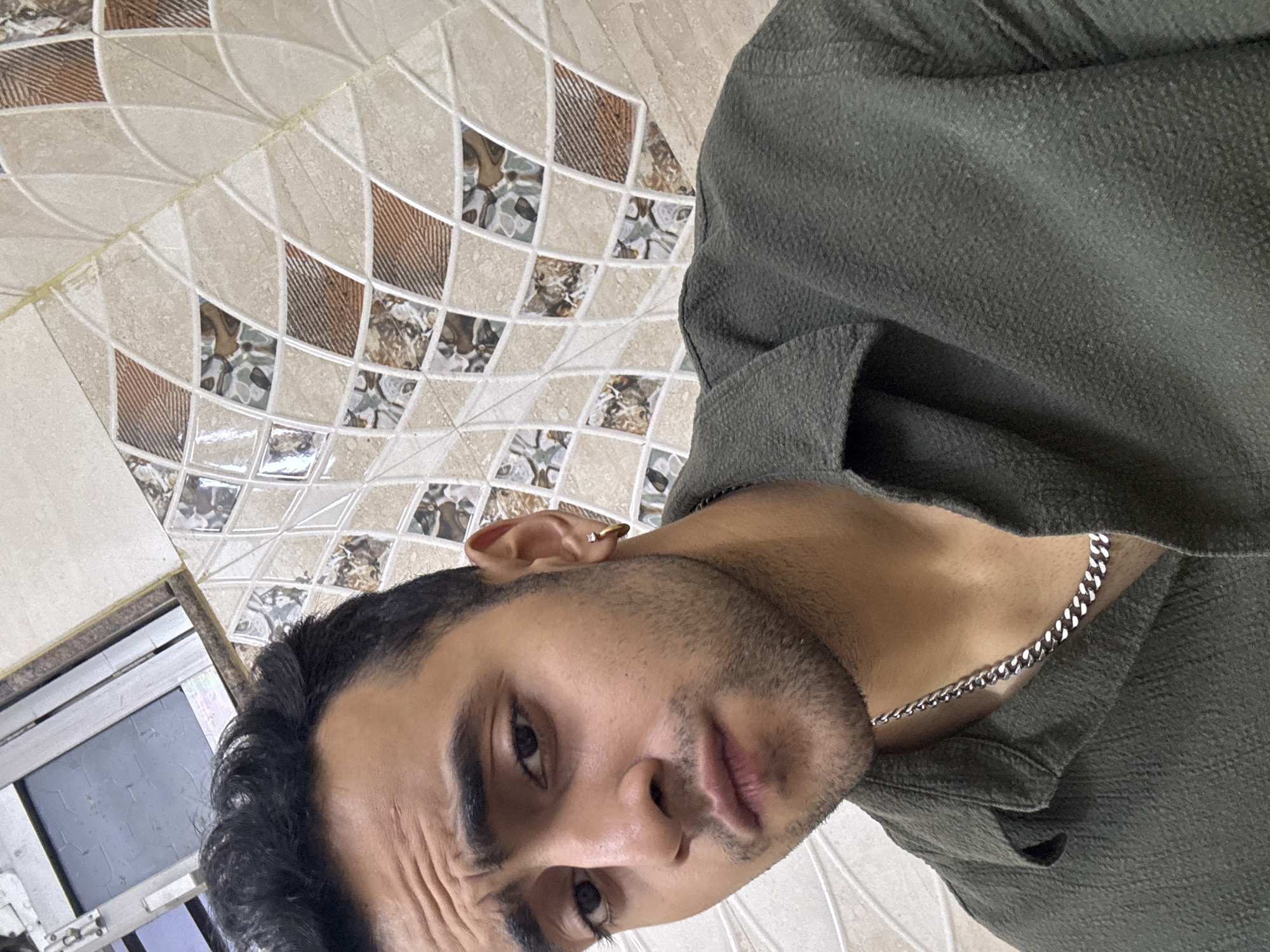 A close-up, upward-angled self-portrait features a young adult male with dark hair and stubble, wearing a dark olive-green textured shirt and a silver curb chain necklace