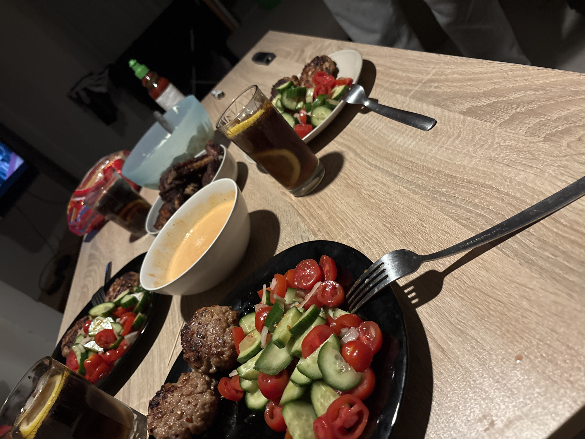 The image displays a meal arranged on a light-colored wooden table within an indoor residential setting in Sofia, Bulgaria, under low light conditions. No individuals are present in the scene. In the foreground left, a black plate holds two round, grilled meat patties, consistent with kyufteta, accompanied by a salad composed of sliced cucumbers, halved cherry tomatoes, and diced white onions. A silver-colored fork with text on its handle rests beside this plate. To the immediate right, a white bowl contains a creamy, orange-hued sauce or dip. Further right, a second white bowl is filled with dark, glazed meat pieces, appearing to be ribs or similar roasted cuts. Two tall glasses, each containing a dark beverage with ice and a yellow lemon slice, are visible: one in the mid-left, appearing partially consumed, and another towards the mid-right, which stands next to a small white plate holding a single meat patty and a smaller portion of the same salad, along with a silver spoon. In the blurred background, a red bottle with a green cap, identifiable as Sriracha hot sauce, is positioned near a light blue plastic bowl. In the upper left background, a television screen is visible, emitting a faint blue light. The remaining background is dark and indistinct, indicating the confines of a room.