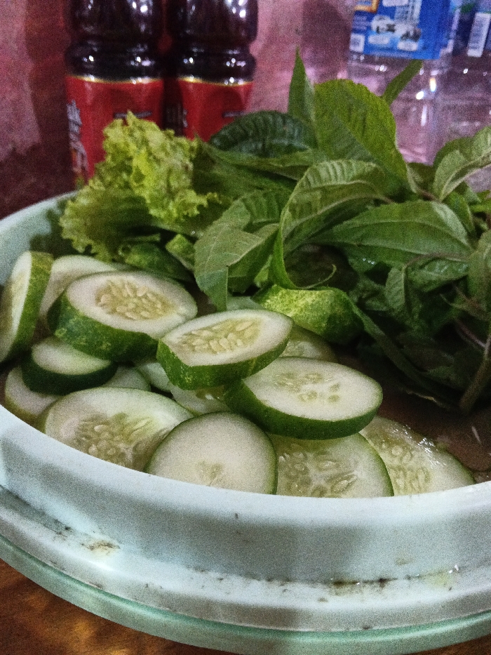 The image displays a light blue circular plastic bowl positioned on a brown, possibly wooden, surface. The bowl contains numerous circular slices of green cucumber with visible pale green flesh and seeds, accompanied by a cluster of vibrant green lettuce leaves and other darker green leafy vegetables. In the background, against a reddish-pink vertical surface, two dark-colored bottles with red labels are present, followed by a clear plastic bottle with a blue label on its cap and body. The scene is static, depicting prepared food ingredients, within an indoor domestic or casual dining environment in Kidapawan, Philippines. No individuals are present, and no actions are discernible.