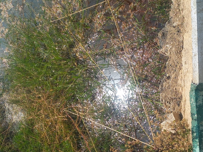 The scene, located in Agingi Zion, Nigeria, depicts a waterlogged outdoor environment under direct sunlight. In the foreground, a low, light-colored concrete or stone edge, partially stained with green/teal, is present. Above this edge, a mound of damp, dark earth mixed with sand and dry plant debris is visible. The midground and background consist of a shallow body of water, possibly a flooded area or marsh, densely populated with green and brown grasses and reeds. Intense sunlight reflects off the water's surface, creating a bright glare in the center. Several slender, light-colored plant stalks or dry reeds lie across the water and vegetation. No individuals or additional man-made structures are visible.