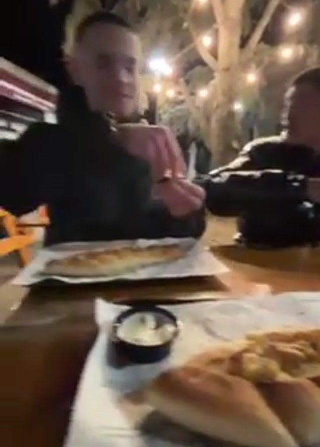 n outdoor dining area at night. Several men are sitting at picnic-style tables, eating and talking. Plates of food resembling Turkish pide are visible on the tables, along with small bowls. String lights illuminate the area. The surrounding buildings are two-story and appear to be in a European style, with shops on the ground floor. One man picks up a plate of pide and walks away from the table. The environment appears to be a pedestrian street lined with restaurants.
