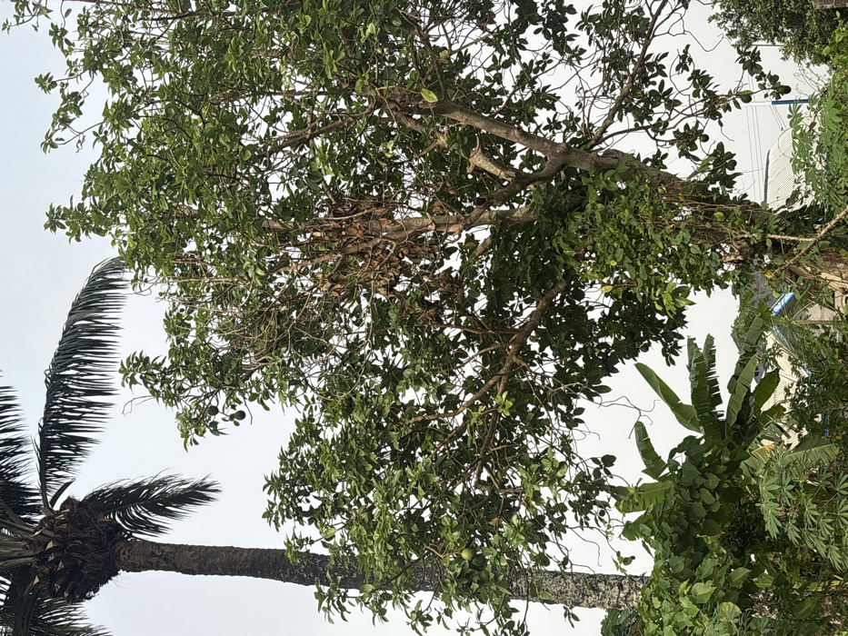 This image depicts a densely vegetated outdoor scene in Ikot Ekpene, Nigeria, under an overcast sky. The central focus is a large, mature tree, likely an avocado tree, abundant with dark green foliage and numerous light green, ovoid fruits hanging from its branches. To the left, a tall, slender palm tree trunk with its fronds extending out of frame at the top is visible. Beneath the main trees, additional tropical plant life is present, including broad-leafed plants resembling banana leaves and what appears to be cassava plants in the lower foreground. In the background, partially obscured by the trees, are the rooftops of several structures, one exhibiting a blue section. No human figures or discernible activities are observed.