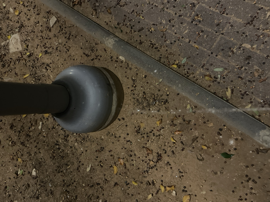 The image depicts a ground-level scene in Tel Aviv, Israel, under artificial illumination. A dark gray cylindrical pole with a rounded, lighter gray concrete base is anchored to a circular concrete slab. The ground immediately surrounding the pole base consists of reddish-brown soil, densely covered with numerous small, dark, spherical objects (resembling fallen berries or seeds), scattered dry yellowish-brown leaves, and minimal green foliage. A long, dark gray, rectilinear object, consistent with a curbstone or low barrier, extends diagonally across the lower portion of the frame, separating the loose soil from a darker, patterned paved surface in the bottom right quadrant. No animate subjects, discernible actions, or interactions are visible. Shadows suggest a light source positioned above and to the left of the frame.