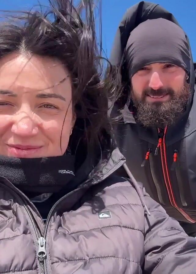 A woman and a man are standing outside on a windy day. The woman is in the foreground, holding the camera and looking at it with a slight smile. Her hair is being blown around by the wind. The man is standing behind her and to her right, also smiling at the camera. He is wearing a beanie and has a beard. Both are wearing dark colored jackets. The sky is blue with some wispy clouds. In the distance, the landscape is arid and brown.