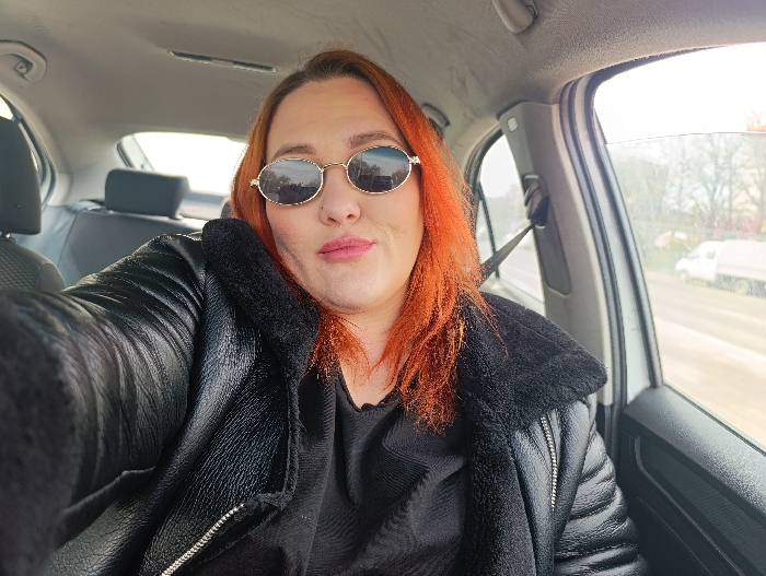 A forward-facing selfie captures an adult female from the passenger seat of a vehicle