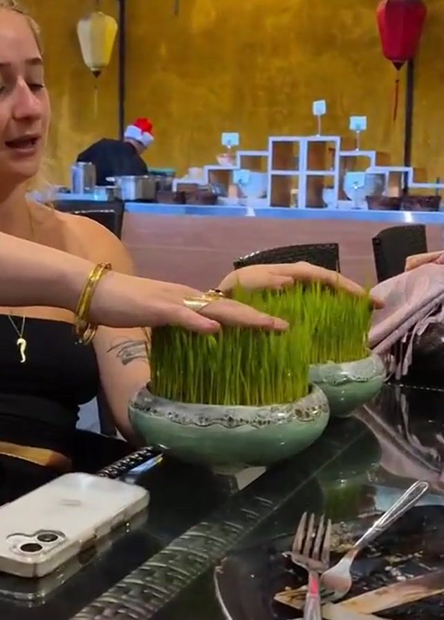 Here's a brief description of the video: A woman with blonde hair is sitting at a table in what appears to be a restaurant or indoor dining area. She is wearing a black strapless top, jewelry, and has a phone next to her. Her hands are resting on two decorative bowls filled with green sprouts resembling grass. The table is glass, with remnants of a meal on a plate nearby. The background features a buffet-style setup, yellow walls, and hanging lanterns. The woman is smiling and seems to be interacting with the camera.