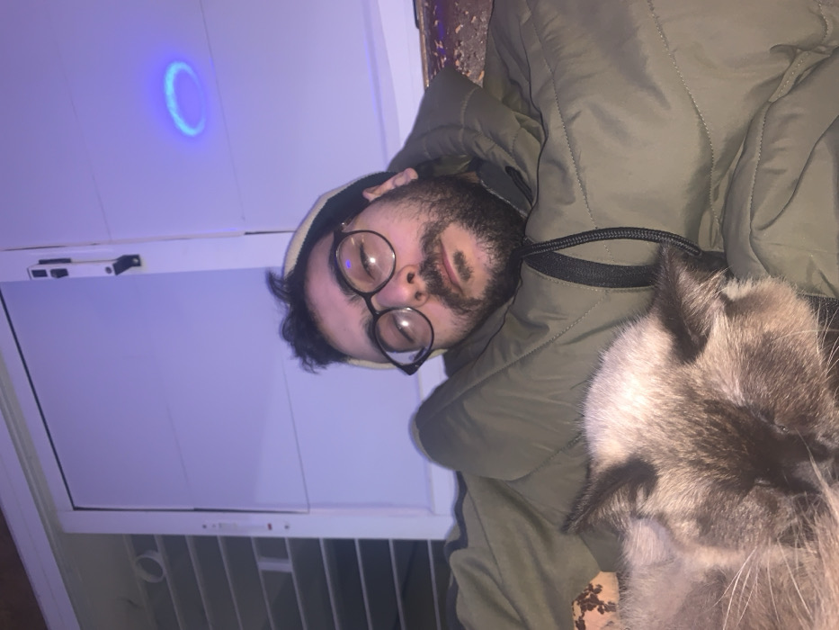 A bearded man with round glasses lies on his back, eyes closed. He wears a green jacket with a black strap across his chest. A Siamese cat rests on his chest, its face partially visible. Above, a white ceiling panel contains a blue ring-shaped light fixture. An air conditioning unit is visible below the panel. The overall image is slightly angled.