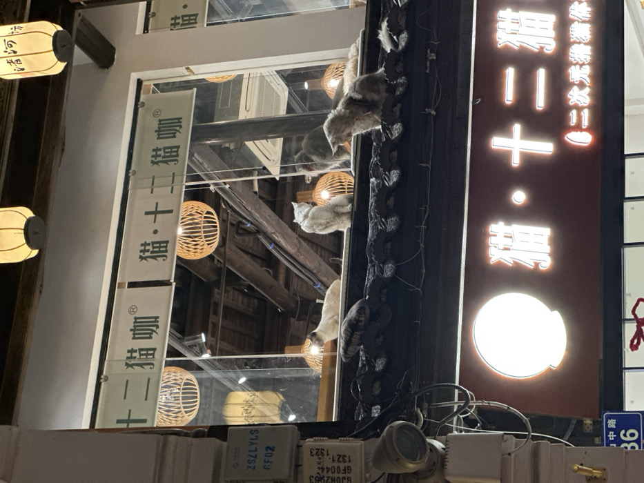 - "The image depicts the illuminated facade of a multi-story building, identified as a "Twelve Cat Cafe" in Shangcheng District, China, likely during evening or nighttime hours" by FM-9vwe03, licensed under CC BY 4.0