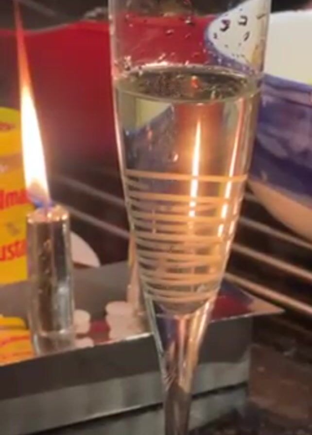 close-up of a champagne glass filled with a clear, bubbly liquid. The glass is decorated with horizontal silver stripes around the lower portion of the bowl. There are a few water droplets clinging to the upper part of the glass. To the left of the glass, a small silver candle holder holds a lit candle with a bright flame. The light from the flame reflects in the liquid in the glass. Behind the candle, there is a yellow box labeled "Helma Mustad" and a red container. The surface the items are on appears to be a black granite countertop. A cracking sound is audible in the video.