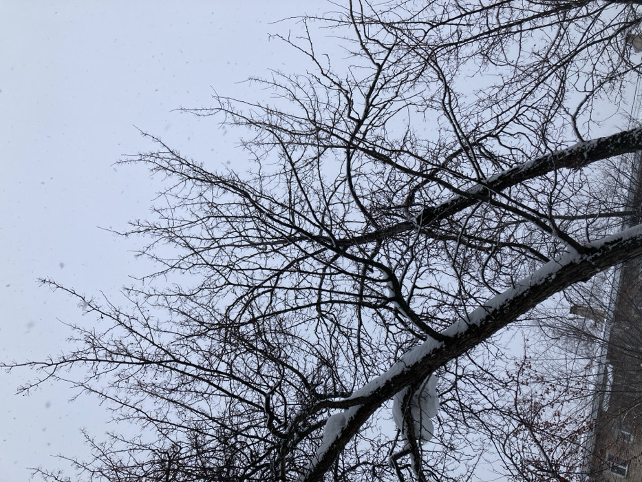 The image depicts an outdoor winter scene in the city of Chaikovsky, Russia, characterized by falling snow and dormant deciduous trees under an overcast sky. The pale grey sky occupies the upper two-thirds of the frame, with numerous small, white snowflakes distinctly visible against it, indicating active snowfall. Dominating the foreground and midground are the bare, dark silhouettes of multiple trees, their intricate network of branches devoid of leaves. Several thicker branches, particularly a prominent one traversing diagonally from the lower-left to the upper-right, are heavily laden with accumulated white snow on their upper surfaces, forming distinct, rounded masses. In the lower-left quadrant, the upper section of a light-colored building, featuring dark rectangular apertures, is visible, partially obscured by thinner branches. Faint chimney structures are discernible above the building's roofline. No individuals or animals are present in the scene. The overall environment conveys a cold, quiet, and snowy winter day within an urban or suburban setting.
