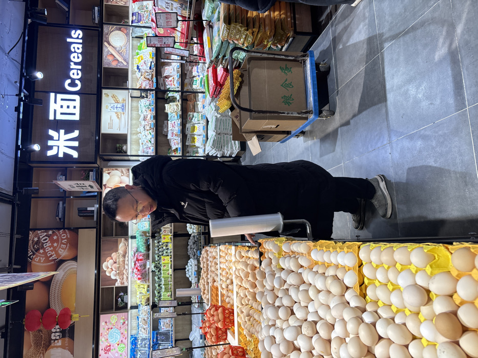 This image depicts an indoor scene within a supermarket or grocery store in Jiangjin, China. An adult male is positioned slightly right of the frame's center, facing left. He wears a dark, long-sleeved winter coat, dark trousers, and grey athletic shoes. He has short, dark hair and wears eyeglasses. His head is turned, and his gaze is directed downwards towards a large, multi-tiered display of eggs. The eggs, predominantly white and light brown, are arranged in yellow cardboard trays and red plastic baskets. Immediately to the male's right, a white roll of plastic film or bags is mounted on a metallic dispenser stand, with his right hand positioned near it. In the mid-ground to the right, a blue utility cart holds two brown cardboard boxes; one box displays Chinese characters translating to "Grain Eggs." Stacks of packaged items in yellow and red bags are visible behind the cart. The background consists of illuminated retail shelving units stocked with various packaged goods, including items displayed under a prominent overhead sign reading "米面 Cereals" in both Chinese and English. Additional background elements include a promotional poster with "APPROVED" text, red decorative lanterns above the egg display, and visible price tags on shelves. The flooring is dark grey tiled.