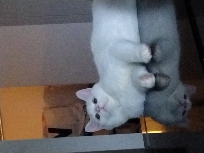 In an indoor setting within the city of Crauthem, Luxembourg, a white feline subject is depicted lying on a dark, reflective horizontal surface. The cat's body is oriented horizontally, with its head slightly elevated and turned towards the upper left, eyes gazing upwards. Its front paws are visible, one exhibiting pink paw pads. A clear reflection of the cat's head and upper body is cast upon the dark surface beneath it. In the background to the left, a partial opening reveals a dimly lit room with light-colored walls, containing a light-colored object with a prominent dark "V" shape. To the right of the feline, a solid, light-gray vertical surface is visible. The scene is illuminated by ambient light, suggesting an interior environment. No human subjects are present.