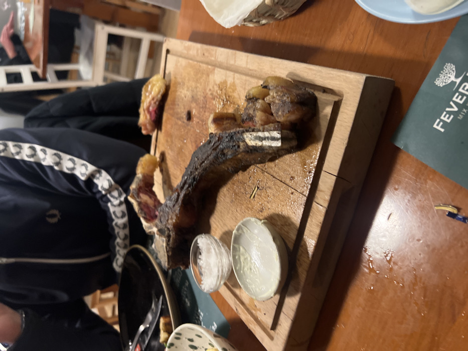 A wooden board holds a bone-in ribeye steak, displaying a charred exterior and juicy interior. To the side, two small bowls contain salt and sauce, respectively. The table features a Fever-Tree mixer booklet and other dining-related items. A person in a blue jacket sits beside the table.