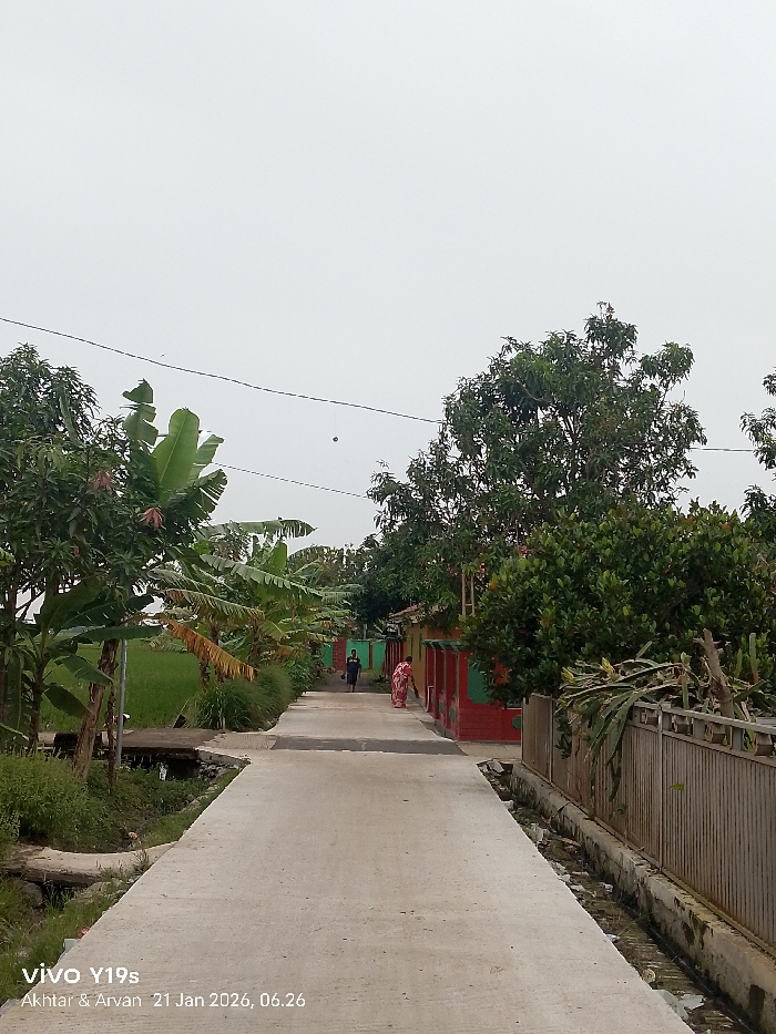 A rural scene showcases a concrete path stretching into the distance, flanked by lush greenery. Banana trees and other vegetation line one side, contrasting with a fence on the other. Two people walk down the path. Overhead, a gray sky hints at overcast conditions. Details visible include drainage ditches along the path's edges and power lines cutting through the sky. A phone's timestamp is visible in the corner.