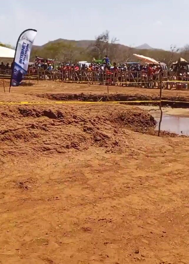 dirt race course with a bright blue sky and mountains in the background. There are many people standing behind a wooden fence, presumably to watch the race. A bright green jeep is parked on the right side of the screen, next to the fence. In the foreground, there are two large piles of brown dirt, separated by a muddy pit. Yellow caution tape runs along the course. A person in a lime green shirt is visible in the bottom right corner, holding a phone up to record. A blue flag with white lettering stands on the left. The race seems to be about to begin.