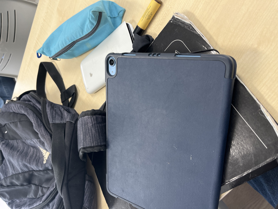 The image depicts a collection of personal items arranged on a light wood-grain table surface in an indoor environment within Burjassot, Spain. In the foreground and center, a dark blue iPad, enclosed in a matching protective case, rests atop a worn black notebook with a white linear design on its cover. To the immediate left, a grey and black Adidas backpack featuring a wavy pattern is partially visible, with its black straps extending across the table. To the right of the iPad, a light blue zippered fabric pencil case is positioned alongside a white rectangular device bearing an Apple logo, identified as a portable power bank. A yellow cylindrical object with a black cap is partially visible near the lower right corner, adjacent to the notebook. In the blurred background, a white chair with horizontal slats is discernible, along with a segment of a leg wearing blue jeans, indicating the presence of an individual.