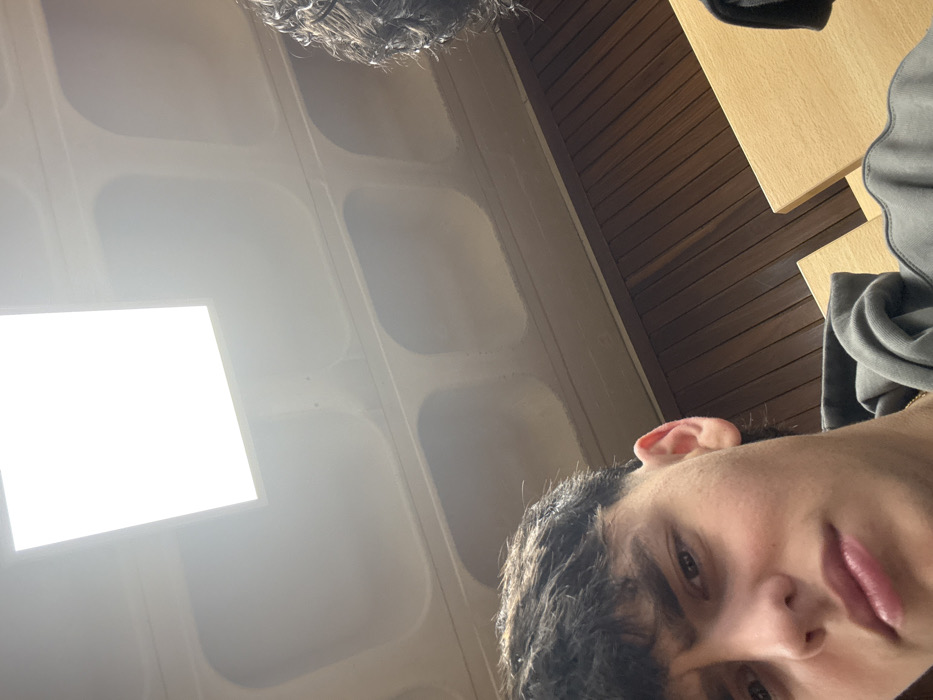 The scene depicts an indoor environment, identified as being within the city of Vila Real, Portugal, consistent with a classroom or lecture hall. The ceiling is light-toned, featuring a grid of recessed, rounded-rectangular panels. A brightly illuminated square LED light fixture is centrally positioned in the upper frame. A dark, vertically slatted wooden wall forms the lower background, partially obscured by light-colored wooden desks or tables. In the lower-left quadrant, a male individual, appearing to be in his late teens or early twenties, with dark, tousled hair, is depicted looking directly at the camera. He is wearing a dark gray hooded sweatshirt. The top of a second individual's head, characterized by dark, curly hair, is partially visible along the right edge of the frame. No discernible interactions or specific actions beyond the primary individual posing for the photograph are evident.