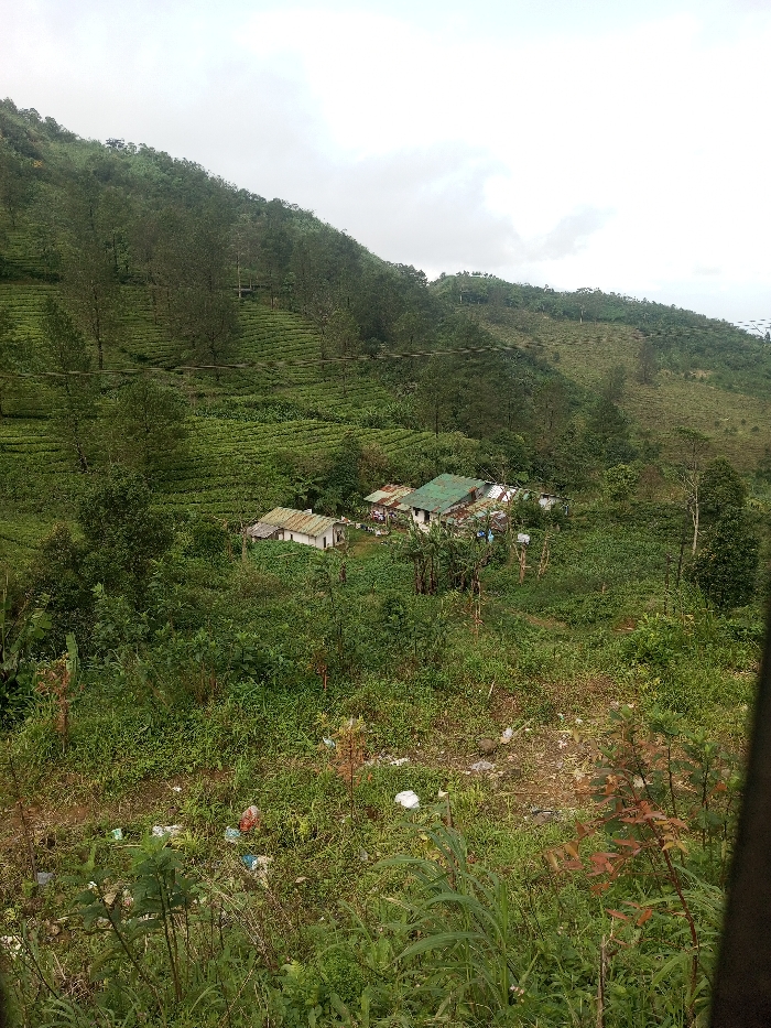 This image presents a detailed view of a rural, hilly landscape in the city of Thanthirimale, Sri Lanka. The scene is dominated by lush green vegetation under an overcast, light grey sky. In the foreground, the immediate ground is covered with dense, unkempt green grasses and various shrubs, interspersed with patches of exposed soil. Scattered among this vegetation are multiple pieces of refuse, including white plastic bags and other colorful plastic debris. A dark, indistinct vertical element partially frames the right side of the foreground. The midground features a small cluster of approximately five single-story, modest residential structures. These houses are nestled amidst abundant greenery, with their roofs displaying varied states of weathering, some appearing to be corrugated galvanized iron (silver-grey) and others showing oxidized green or reddish-brown hues. Above these dwellings and extending across the midground, several thin, horizontal lines are visible, likely power lines or utility cables. Beyond the houses, the terrain rises steeply, forming hills and mountains that are extensively terraced and cultivated. These terraces are uniformly covered with rows of dark green tea bushes, creating a distinctive pattern on the slopes. Taller, slender evergreen trees are interspersed within these tea plantations and on the higher, less cultivated parts of the hills. No human figures or animals are visible, and no specific actions are depicted within the frame. The overall environment suggests an agricultural area, specifically a tea-growing region, characterized by its steep, densely vegetated slopes.
