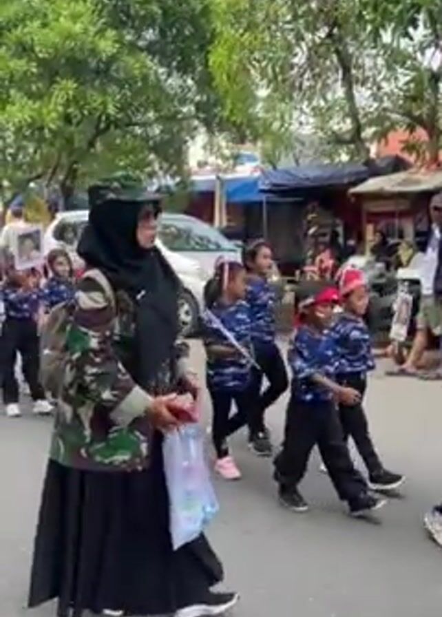 A group of young children and one adult woman in a military-style outfit are walking along a street. The children are wearing matching blue and black outfits and some are carrying small flags. The woman is wearing a camouflage jacket, a black hijab, and black pants. She is holding a phone in one hand and a bag in the other. They appear to be participating in a parade or event of some kind. The background shows trees, cars, and some buildings.