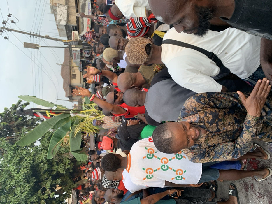 A dense crowd gathers on a street, featuring a mix of men, women, and children. Some individuals hold up their hands and are wearing red, black, and yellow attire. A small tree with banana leaves stands out among them, adorned with colored ribbons. The street is lined with buildings, and overhead electric poles are visible. The scene captures a vibrant atmosphere of community and celebration.