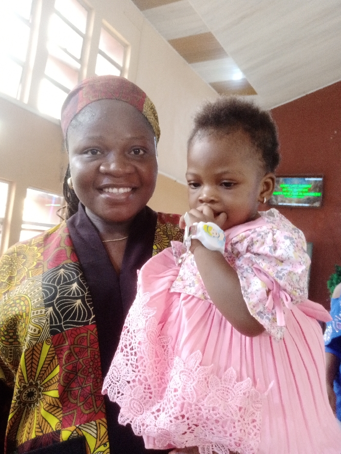 The scene, located indoors in Ukwu-Abwa, Nigeria, captures an adult female holding an infant
