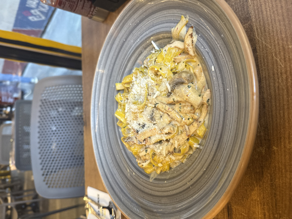 The image displays a close-up of a pasta dish centered on a wooden table within a restaurant setting. The main subject is a grey, ridged ceramic plate containing a serving of fettuccine or tagliatelle pasta coated in a creamy, light beige sauce. Visible ingredients in the pasta include sliced mushrooms, pieces of shredded chicken or light-colored meat, and yellow kernels, possibly corn. The dish is heavily garnished with grated white cheese, likely Parmesan, and fine green herbs. To the left of the plate, silver cutlery (a fork and knife) rests on a white napkin or menu bearing partially visible dark text, "KÖMÜR C." To the right, a red-capped bottle, appearing to be hot sauce or ketchup, and a dark rectangular object are present on the table. The table surface is a medium-brown wood with visible grain. The background is out of focus, showing the interior of the restaurant and a view outside through a large window. Inside, out-of-focus grey chairs with perforated mesh backs are visible. Outside the window, a blurry blue-on-white sign clearly displays the words "VAN" and "PİZZA," indicating a "Van Pizza" establishment. Adjacent to this sign, vertical yellow and black stripes are visible, suggesting a storefront or awning. The scene is situated in a restaurant, specifically identified by the "VAN PİZZA" signage, located in an urban environment in Istanbul, Turkey.