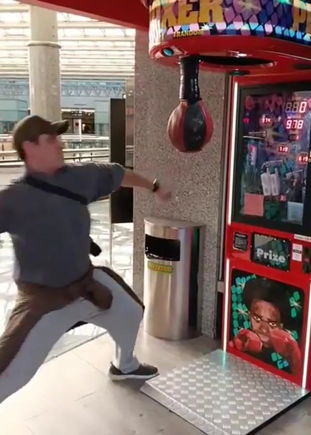 A man in a gray shirt, gray pants, and a brown jacket is hitting a boxing arcade game in what looks like a mall or airport. The man is wearing a black baseball cap and has a bag slung over his shoulder. He throws one strong punch at the punching bag connected to the arcade game. The arcade game is red and displays the score. The game is called "Boxer Prize". There is a stainless steel trash can next to the arcade game and a tiled floor. In the background there is a second floor and various shops.