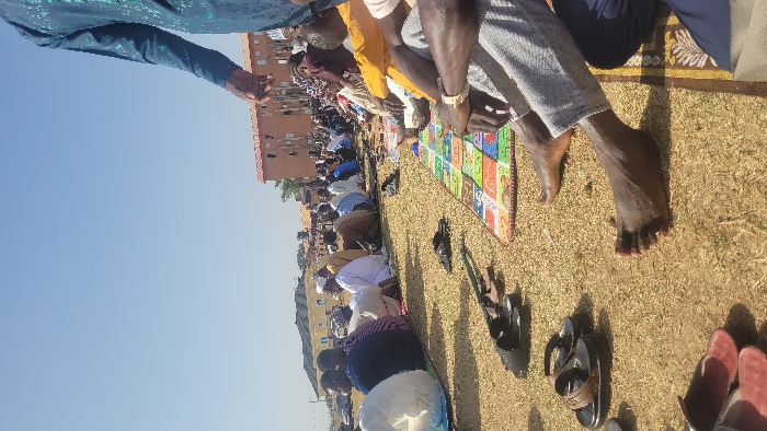 The scene depicts an outdoor gathering of approximately fifty to sixty individuals, predominantly adult males, seated on dry, sparse grass and prayer mats
