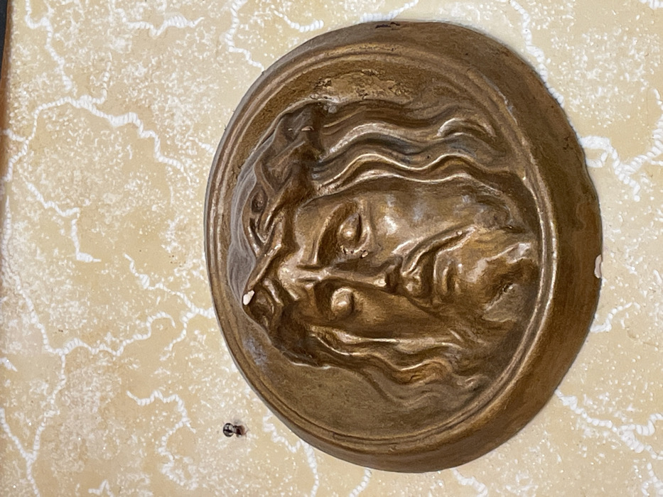 A circular, bronze-colored bas-relief depicting the face of Jesus Christ is centrally positioned on a light beige wall in Vitsebsk, Belarus