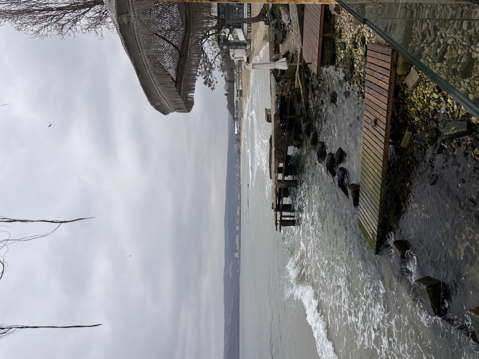 The image depicts a coastal scene in Varna, Bulgaria, under an overcast grey sky with two small birds in flight. The Black Sea presents a calm, grey-green surface with gentle waves breaking against the shoreline. In the immediate foreground, the shore is rocky and covered with pebbles and concrete debris. Two wooden plank platforms are visible on the rocky ground; one is partially submerged in the water and appears weathered with green discoloration, while the other is slightly elevated. A dilapidated concrete pier, supported by multiple pillars, extends from the shore into the sea in the mid-ground, showing significant structural damage. A white, folded beach umbrella stands upright on the debris-strewn ground to the right of the pier. Further along the coastline, a sandy beach is visible, transitioning into a developed area with a white building featuring large windows, possibly a restaurant or hotel, flanked by bare trees. Across the bay in the distance, a city skyline extends along the base of rolling, tree-covered hills. In the upper right corner of the frame, a large, rounded macrame-style umbrella or canopy with a fringe is prominently visible, partially obscuring the background. Dark, thin, indeterminate linear objects, possibly vines or wires, hang into the upper left portion of the image. No individuals are present in the scene.