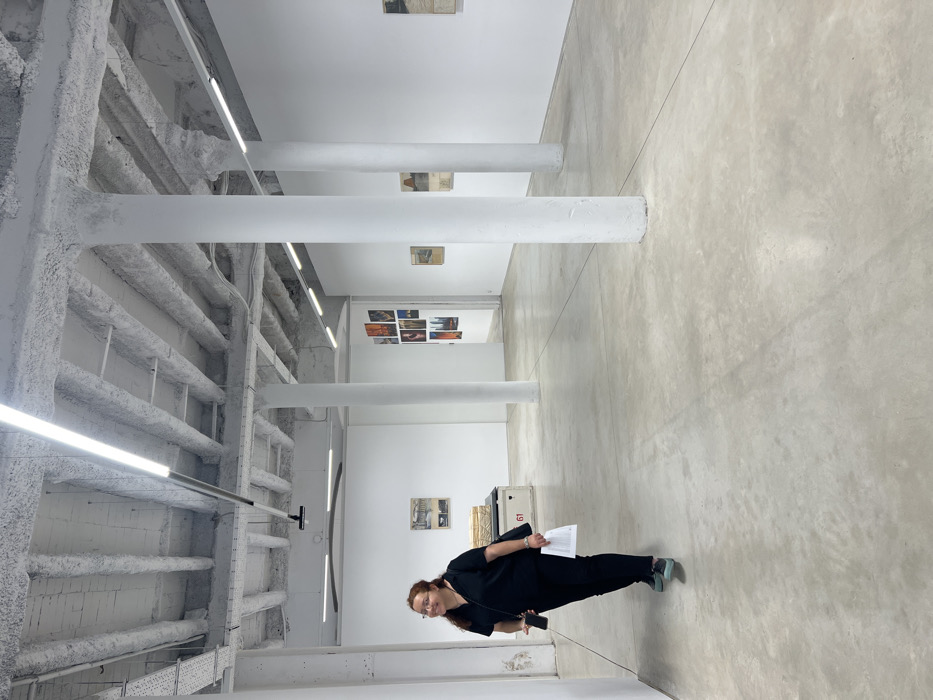 An interior view of a spacious, contemporary art gallery in Barcelona, Spain, features one female subject and multiple artworks