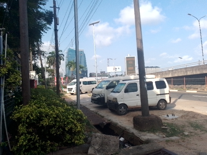 Three white vans are parked alongside a road, with a modern glass skyscraper visible in the background. The foreground features green shrubbery, utility poles, and a concrete drainage ditch. Above, the sky shows a mix of blue and clouds. An overpass spans the road on the right side of the frame. A digital billboard is visible near the parked vans, displaying scrolling text.