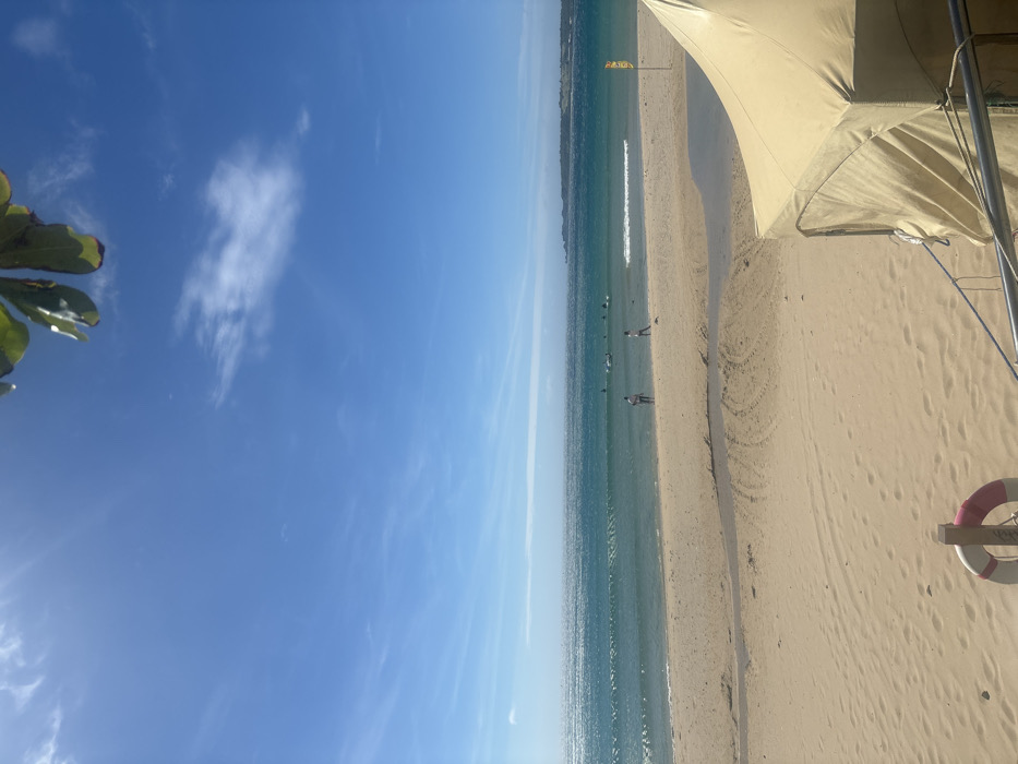 This image depicts a sunny beach scene in Hengchun, Taiwan, viewed from a slightly elevated perspective. The upper half of the frame is dominated by a clear, bright blue sky with sparse white cirrus clouds. Green foliage from an unseen tree partially obscures the very top edge of the frame. The mid-ground features a turquoise ocean with visible small waves breaking towards the shore. Approximately five to seven individuals are distributed across the water, each on a surfboard or bodyboard, indicating surfing activity. The lower half of the image displays a wide expanse of light brown sandy beach. A shallow, narrow water channel or wet depression cuts across the sand from the foreground towards the ocean, creating darker, damp areas. Tire or vehicle tracks are discernible in the dry sand. Two individuals stand on the wet sand near the water's edge, both facing the ocean: one male in a white shirt and dark shorts, and one female in light-colored clothing. A yellow rectangular flag is planted on a pole in the sand on the right side of the beach. In the immediate foreground, a portion of a tan canvas tent structure is visible on the right, with horizontal metal railings extending from it. A red and white life preserver is mounted on a wooden post in the bottom-left corner of the frame.