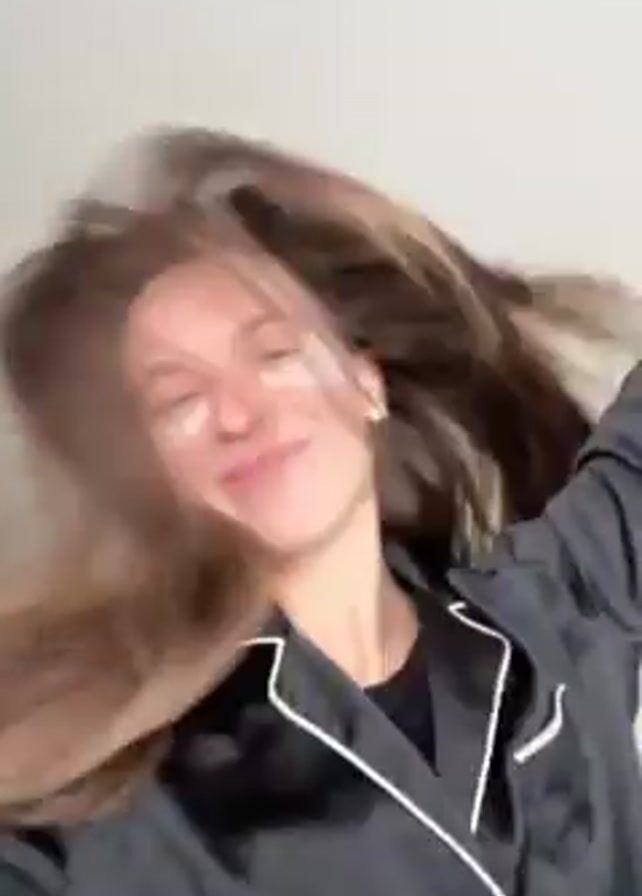 A woman with long brown hair is dancing in a room, likely her house. She is wearing a black satin pajama top with white piping. There are white patches under her eyes. A Christmas tree is visible in the background, along with a beige couch. She is smiling and appears happy. The camera is close to her face and moves erratically as she dances.