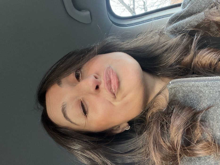 A woman with long, wavy brown hair is pictured from an angled perspective. She is wearing a gray zip-up jacket. Her face is the primary focus, with one eye closed and her lips puckered in a playful expression. The background suggests she's inside a car, visible by the window and interior ceiling. The overall image has a casual, selfie-like quality.