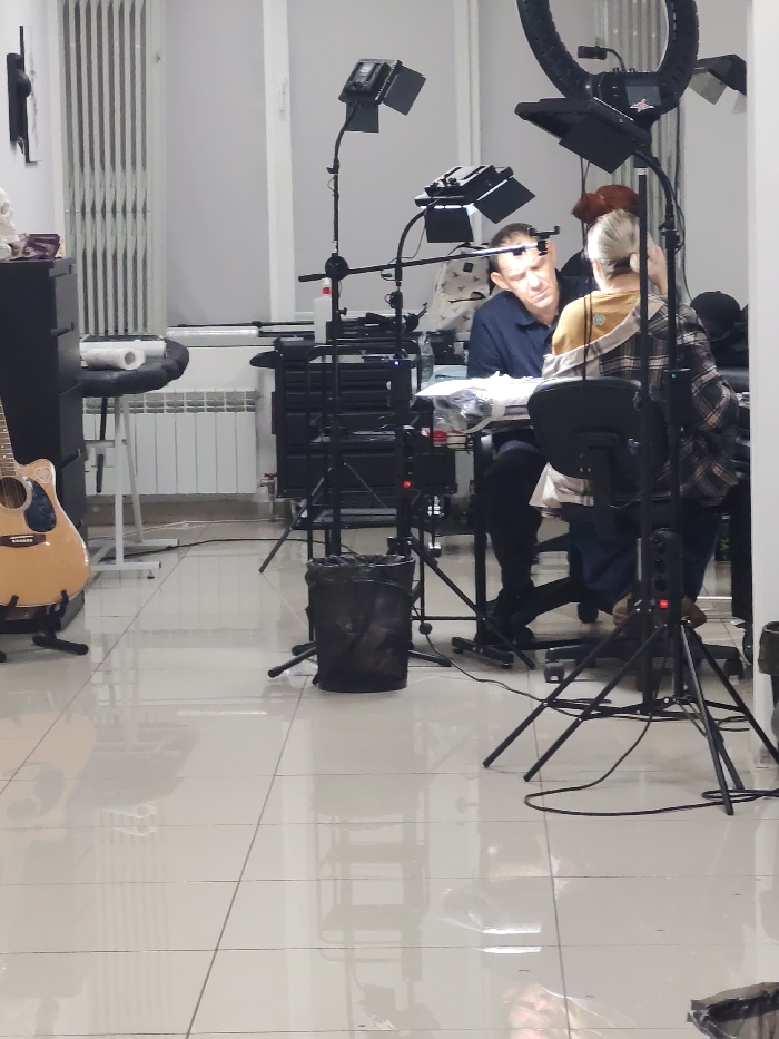 The image depicts an indoor scene within a professional studio environment, likely a tattoo or permanent makeup parlor, located in Rostov-on-Don, Russia
