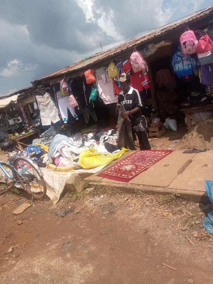 This image captures an outdoor market scene in Kafanchan B, Nigeria, under a partially overcast sky with prominent clouds