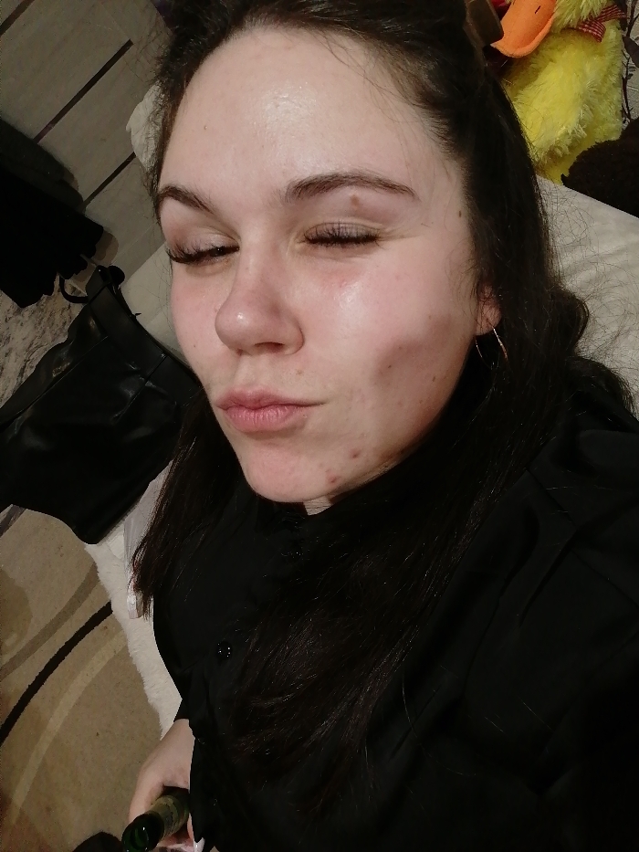 A female individual is depicted in a close-up, high-angle indoor shot. Her eyes are closed, and her lips are pursed. She has dark hair, a light complexion, and exhibits scattered red blemishes on her cheeks and chin. A small hoop earring is visible in her right ear. She is wearing a black collared shirt with buttons. Her left hand, partially visible in the lower left corner, holds a green glass bottle. The background includes a white pillow or bedding behind her head, a yellow plush toy with an orange beak in the upper right, and a black bag or purse on a surface to her left. A patterned rug or carpet is visible in the lower left foreground. The specific location within the city of Chaikovsky, Russia, cannot be determined from the visual information presented in the image.