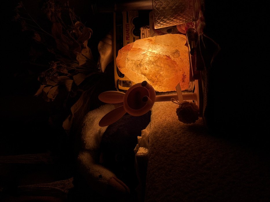 The scene, located indoors in Toksovo, Russia, depicts a dimly lit arrangement of objects centered around a glowing light source. A large, irregular-shaped Himalayan salt lamp emits a warm orange light, illuminating the immediate vicinity. To the left of the salt lamp stands a pale, stylized bunny-head object on a vertical stand, with a small spherical item hanging from its base. To the right, a clear, textured glass cup is visible. In front of the lamp, an elongated dark object rests on a surface. These items are positioned on a light-colored, textured fabric, possibly a blanket. In the background, partially obscured by shadow and the orange glow, a stuffed animal resembling a goose or duck lies to the left. Behind the lamp, a toy vehicle, possibly a bus with the word "PEANUTS" visible on its side, is present. Above the toy, a dark arrangement of dried flora is arranged. Further in the upper left background, hanging strands of decorative beads or garlands are discernible. No individuals are present, and no active interactions are occurring. The environment suggests a domestic setting.