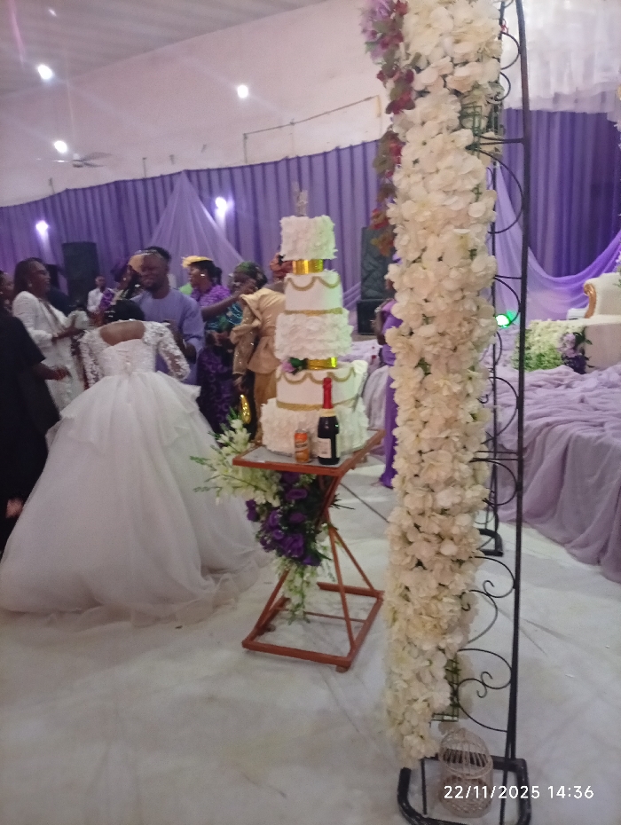 The image depicts an indoor event, identified as taking place in Shaba, Nigeria, on 22/11/2025 at 14:36. The setting is an event hall with a light-colored floor, possibly tiled or marble. The background features purple drapes and sheer fabric, indicative of a festive occasion. Overhead lighting fixtures and a ceiling fan are visible. In the foreground, a prominent four-tiered white wedding cake with gold banding and ruffled white icing stands on a triangular light-brown wooden display table. Purple and white floral arrangements adorn the base of this table. Two small bottles, one dark and one light, are placed on the cake table next to the cake. To the right of the cake, a tall black metal stand is heavily decorated with white floral garlands, and a small white decorative birdcage rests at its base. Several people are visible in the mid-ground. A person in a white long-sleeved ball gown wedding dress, presumably the bride, is positioned with her back mostly to the camera, standing near the cake. A man in a light purple shirt stands behind the bride, looking towards the cake. Other guests in formal attire, including individuals in traditional Nigerian garments, are scattered around the area, some appearing to mingle or observe the scene. In the far right background, another white cake is partially visible on a purple-draped table.