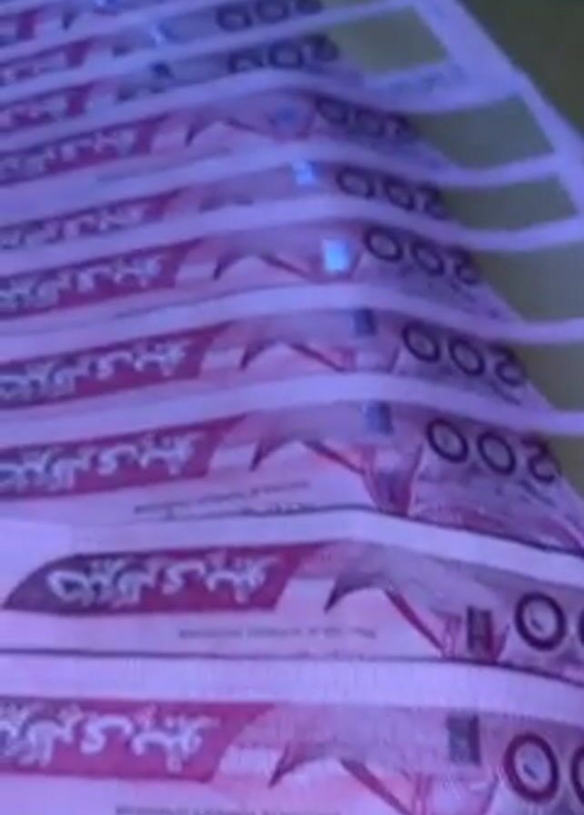 close-up view of a fan-like arrangement of Nigerian 200 Naira banknotes. The bills are pink and feature a portrait. The surface underneath appears to be green or gold. The lighting in the video is somewhat uneven and flickers slightly, giving the scene a slight purplish hue at times.