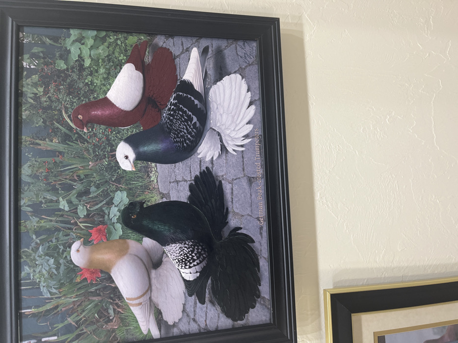 The image displays a framed print or painting of four German Beak-crested Trumpeter pigeons, mounted on a light-colored, textured wall