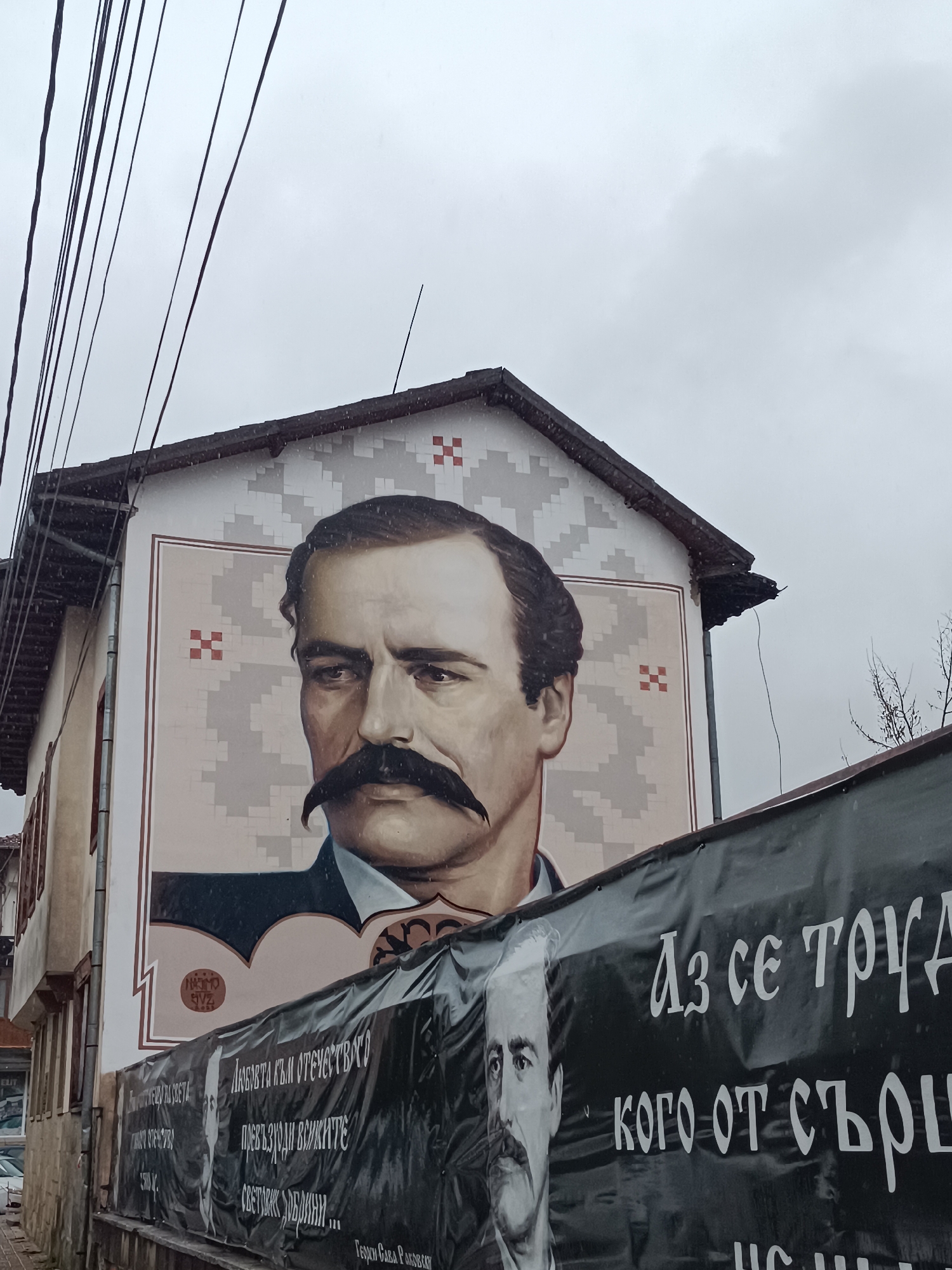 The image captures a mural of a distinguished man with a large mustache on the side of a building in Kotel, Bulgaria