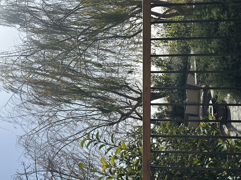 An outdoor scene in Safed, Israel, is observed through a dark metal railing featuring a wooden top handrail. In the midground, a landscaped patio area is visible, containing a semicircular stone seating structure fitted with light-colored cushions. A dark, cylindrical object, possibly a fire pit, rests on the paved ground in front of the seating. This patio area is bordered by various green bushes and foliage. The background showcases a clear, bright blue sky above several trees. A prominent weeping-style tree with long, sparsely leaved, green-yellow branches occupies the right side, while other trees with bare or minimally leaved branches are visible elsewhere. No individuals or active interactions are present.