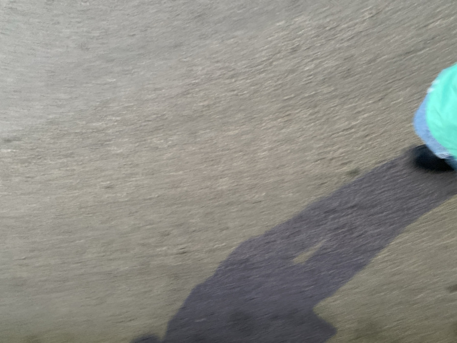 The scene depicts an outdoor ground surface in Kerker, Tunisia. A light-colored, textured ground, possibly concrete or asphalt, occupies the majority of the frame. A long, distinct human shadow is cast across the ground, extending from the upper left towards the lower right, indicating the presence of a person and an overhead light source. In the bottom right corner, a portion of a human left leg and foot is visible. The person is wearing light blue trousers and a bright turquoise or light green shoe with a black sole, presumably in the act of walking.