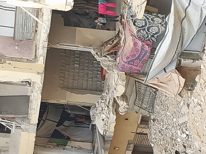 The image depicts a heavily damaged multi-story building in Khan Yunis, Palestinian Territory, characterized by structural collapse and significant debris. The upper visible floors show exposed concrete and rebar, with portions of walls missing. On a middle level, an interior space is visible through a missing outer wall, revealing a black barrel, a red chair, and clothes hanging. Below this, a young individual, likely a child, stands on a partially intact floor or balcony on the right side, wearing a light-colored top and dark pants, with arms slightly raised near their face. Adjacent to this child, pink clothing hangs on a line. The lower sections of the scene are dominated by rubble and concrete debris, with patterned rugs or blankets draped over damaged structures and makeshift shelters constructed from tarpaulins (white and beige) at ground level. A metal grate or fence lies amidst the debris. The scene suggests an urban environment severely impacted by destruction, with signs of continued human presence.