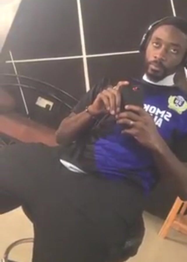 man sitting on a metal-framed stool in front of a reflective surface, presumably a mirror. He is wearing a black and blue sports jersey with the word "SMOKE" visible on the front, along with black sweatpants. He has a short beard and is wearing headphones. He is holding a smartphone and appears to be taking a selfie in the reflective surface. Behind him, there is a wooden chair with a patterned cushion, a small wooden stool, and a black wall with white grid lines. The floor is tiled and shiny. Upbeat music is playing in the background.