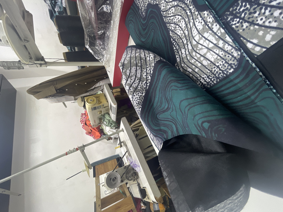 A cluttered workspace features a variety of items related to sewing and tailoring. Two sewing machines sit on tables, surrounded by tools and fabric scraps. A roll of patterned fabric dominates the foreground, with a design that includes green and gray wavy lines and dots. A clothing rack behind the sewing machines holds various garments, including a brown shirt. A metal pole spans the room horizontally.
