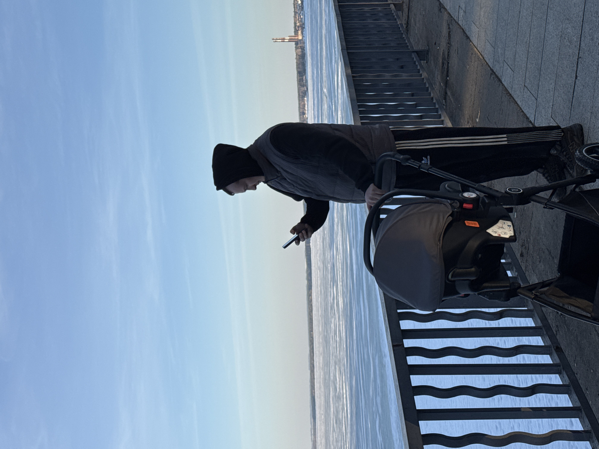 A man wearing a black beanie, vest, and Adidas track pants stands next to a baby stroller on a riverside promenade